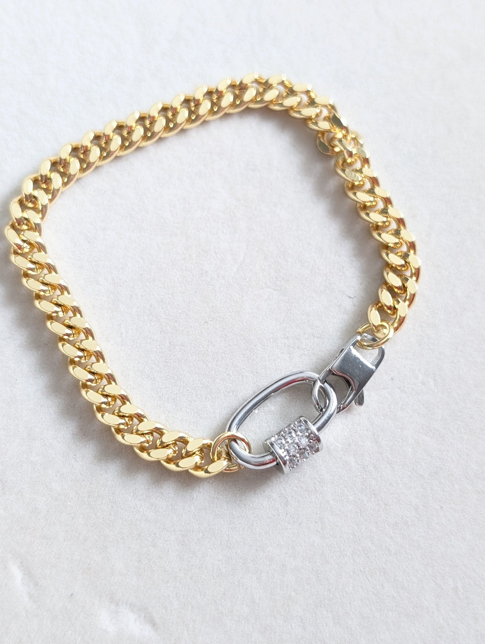 A classic with an edge. The Bond Bracelet features a gold filled Cuban chain paired with a sleek gold carabiner-style connector accented with micro-pavé sparkle. Finished with a durable lobster clasp, this mixed-metal beauty brings effortless shine to your everyday stack.
