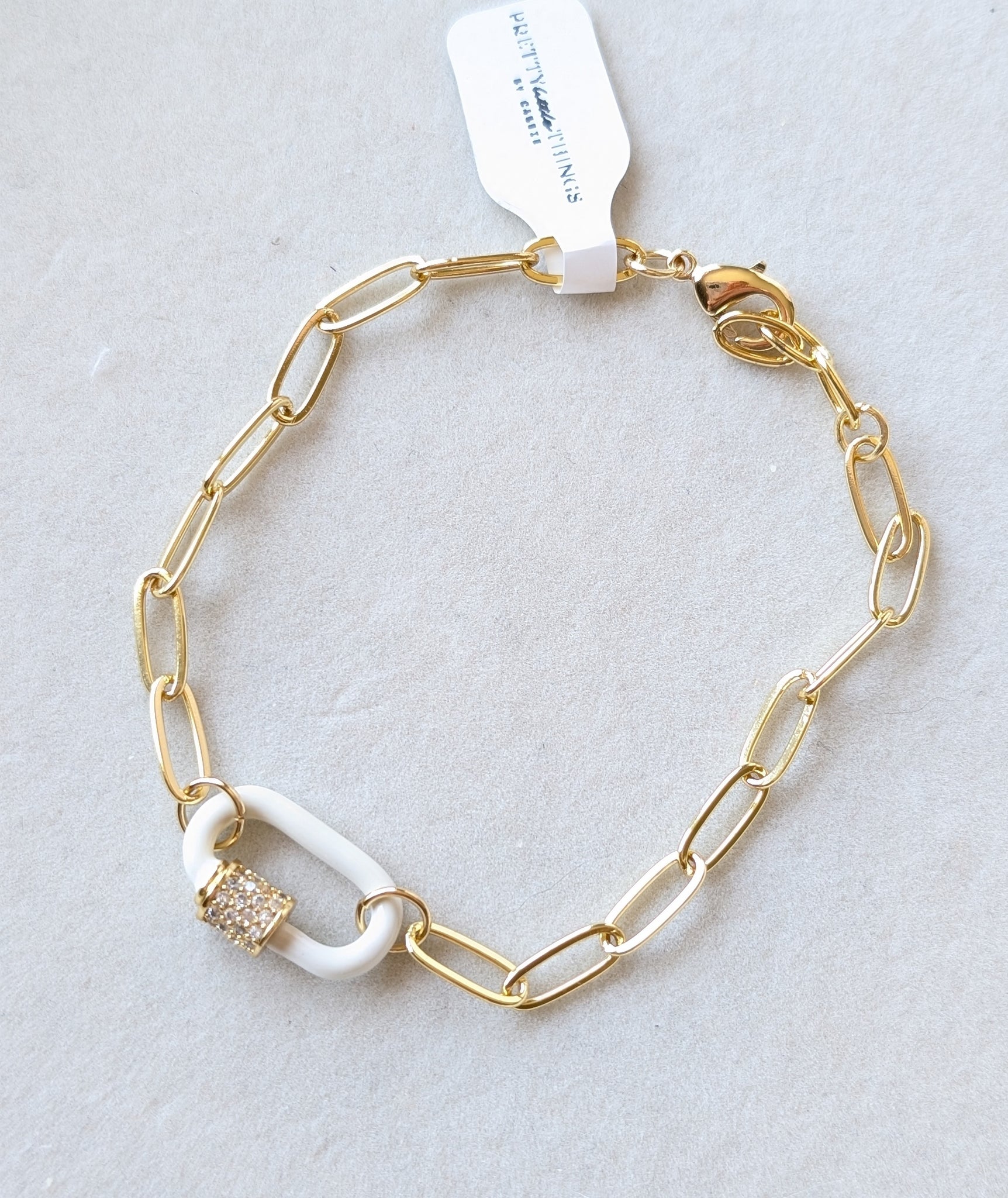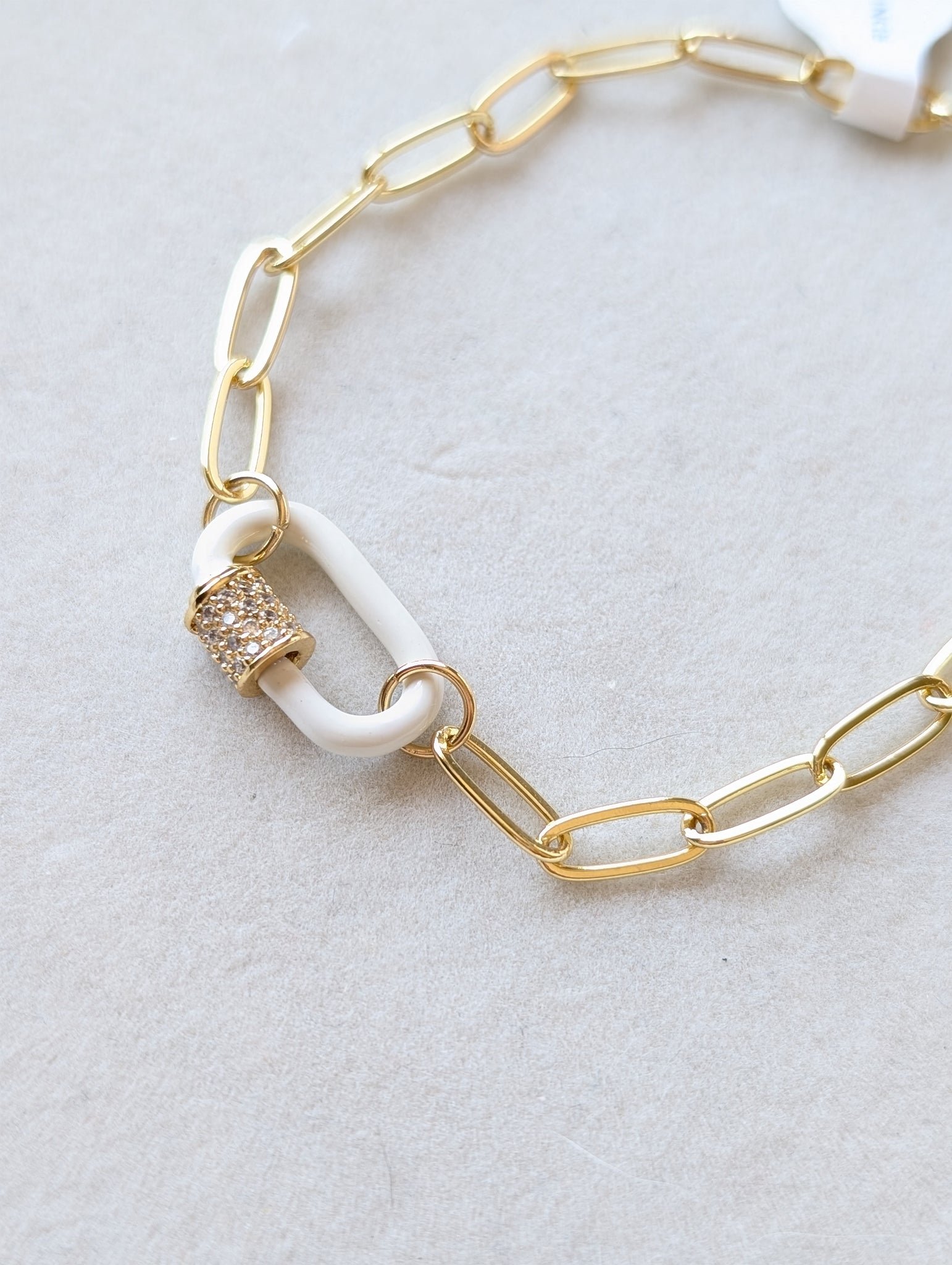 A gold-filled paperclip chain bracelet featuring a white enamel accent link with a pavé connector for a modern, elevated touch. Chic on its own or stacked with your everyday favorites.