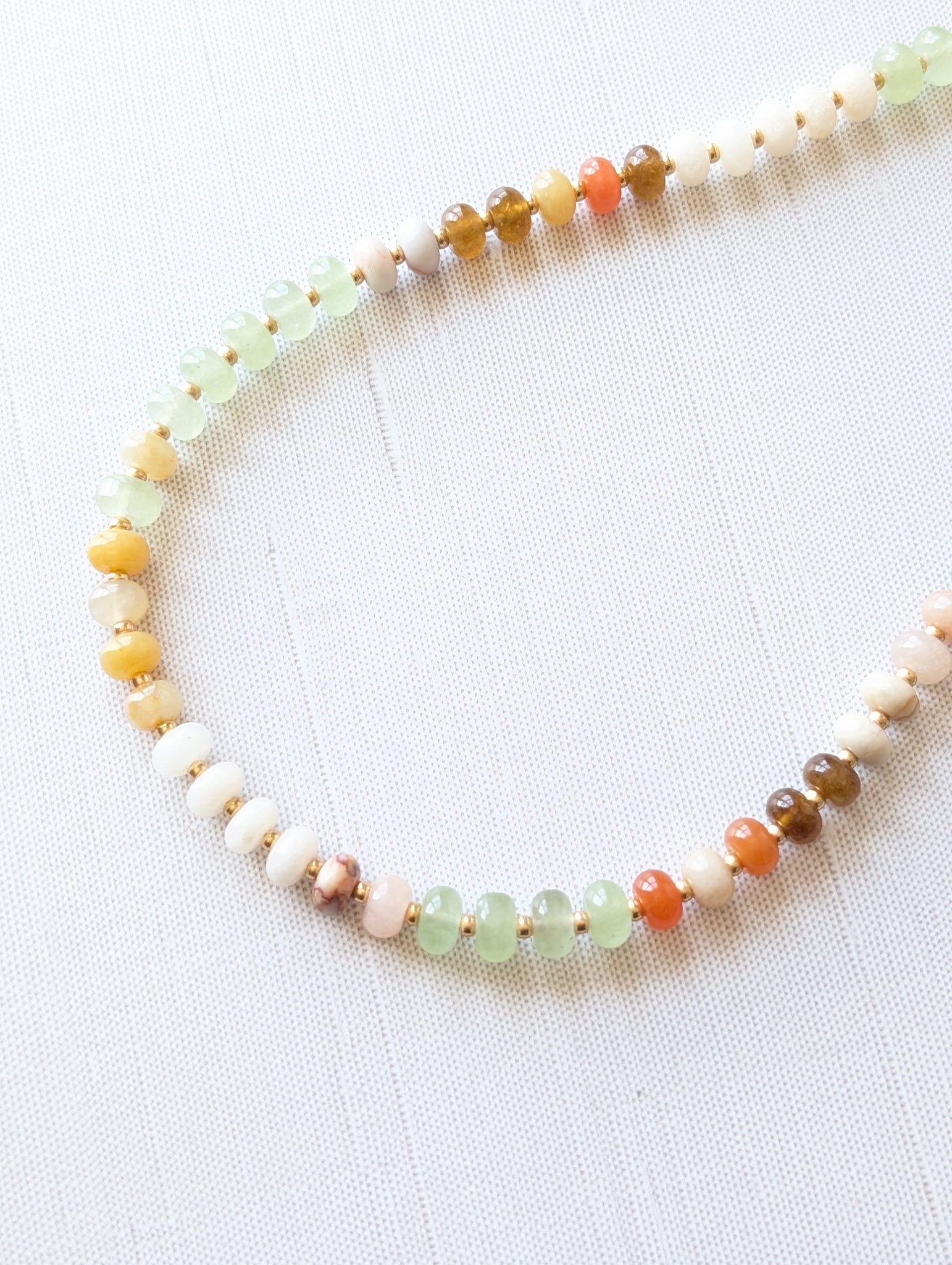 A soft, everyday beaded necklace designed to layer effortlessly or wear on its own. The Meadowstone Beaded Necklace features a balanced mix of natural gemstone beads in creamy ivory, sage green, warm amber, and muted peach for subtle color and texture.