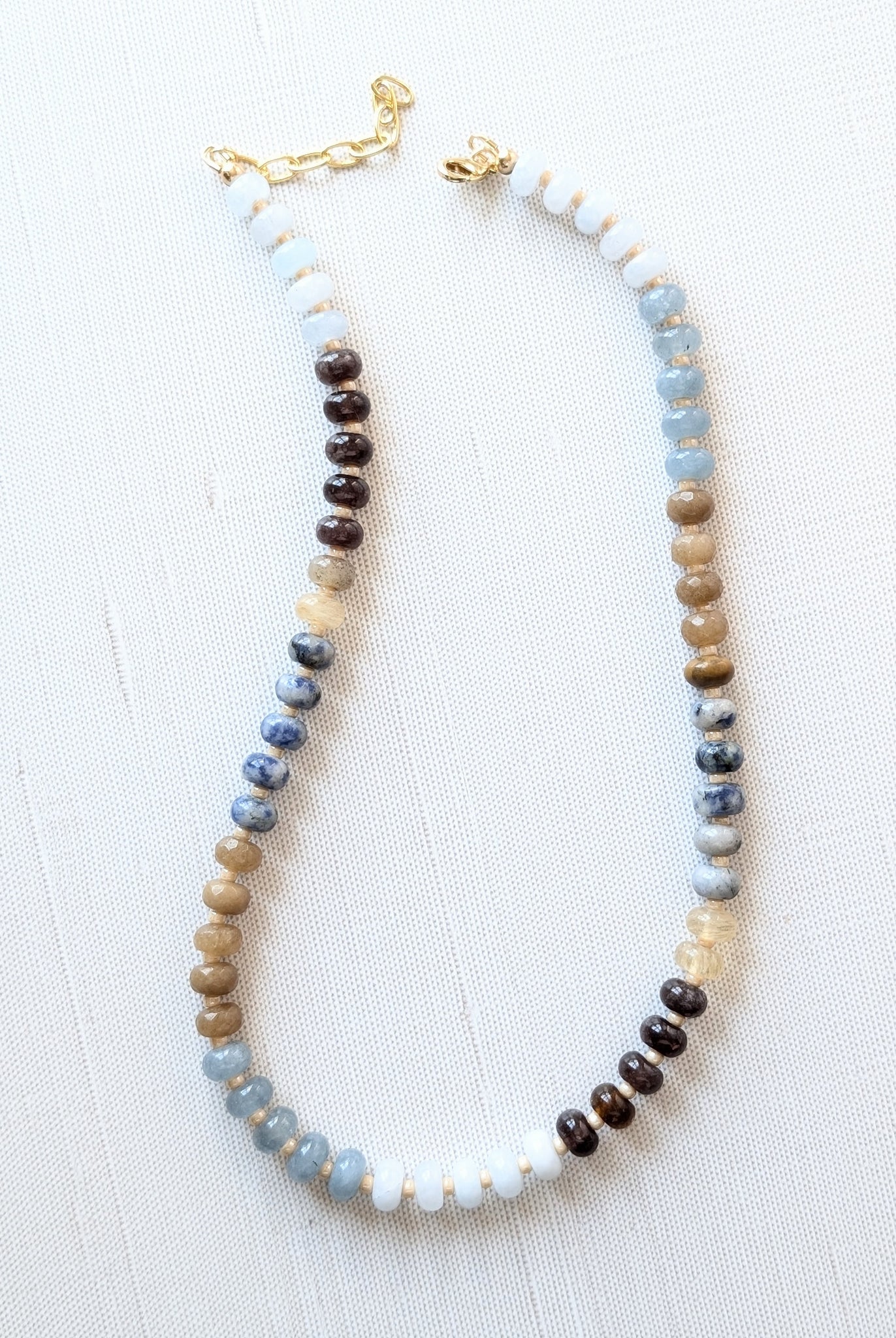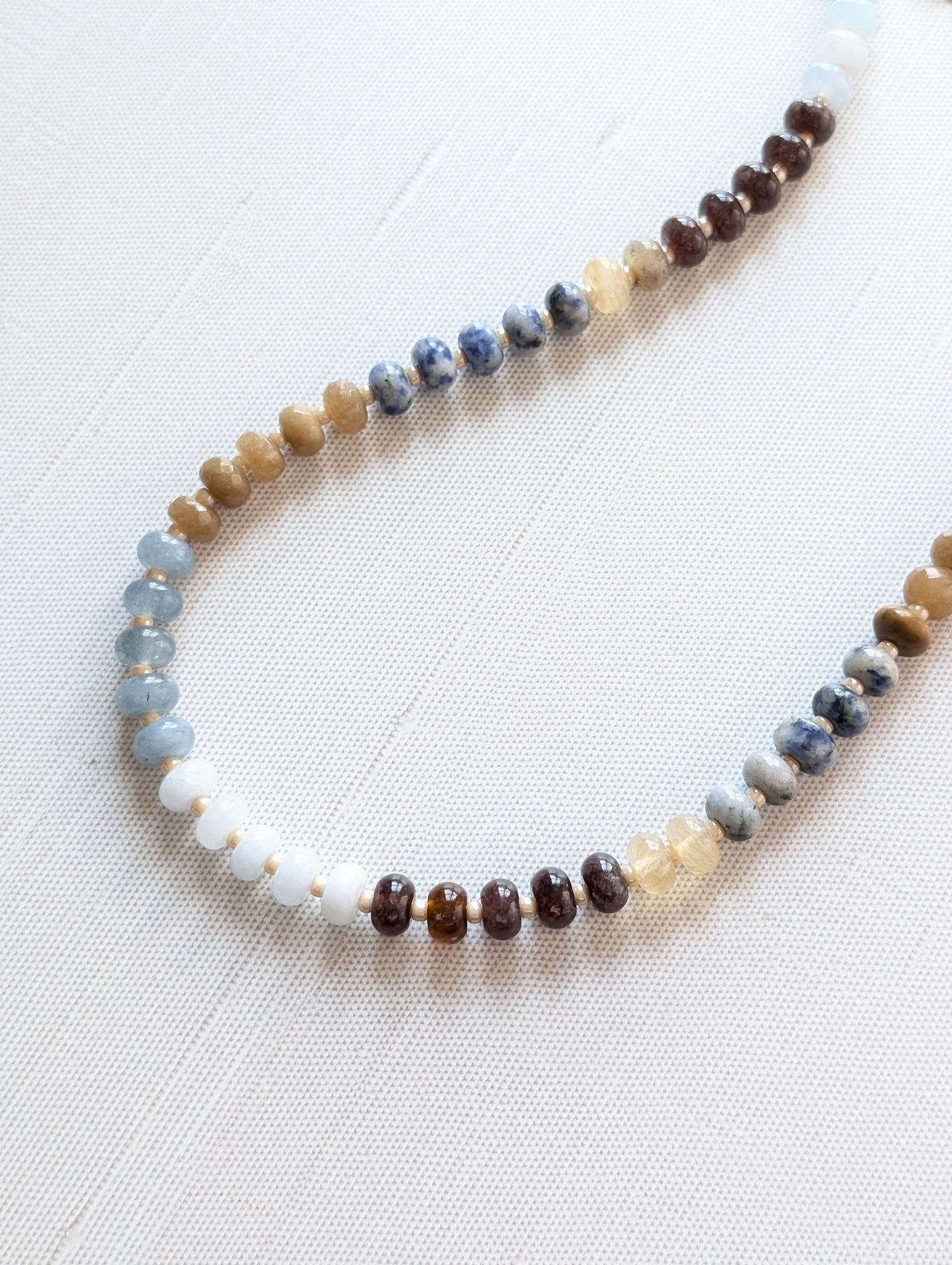 Hand-strung with gemstone beads in fall-inspired blue tones