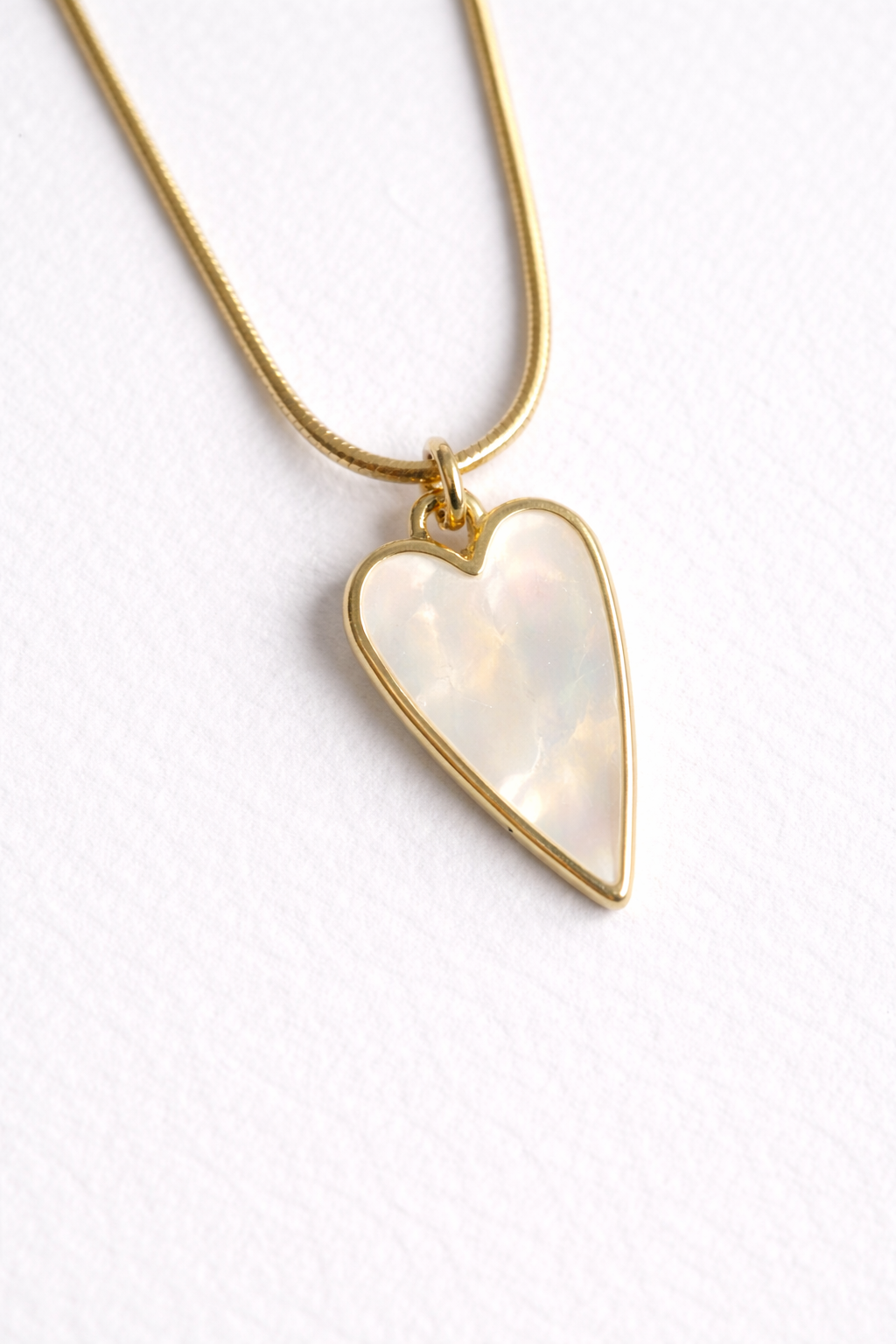 Minimal and refined, the Pearl Edge Heart features a smooth mother of pearl heart framed in a slim gold edge. Finished on a flat gold filled snake chain, this piece catches the light beautifully and layers effortlessly with everyday favorites.