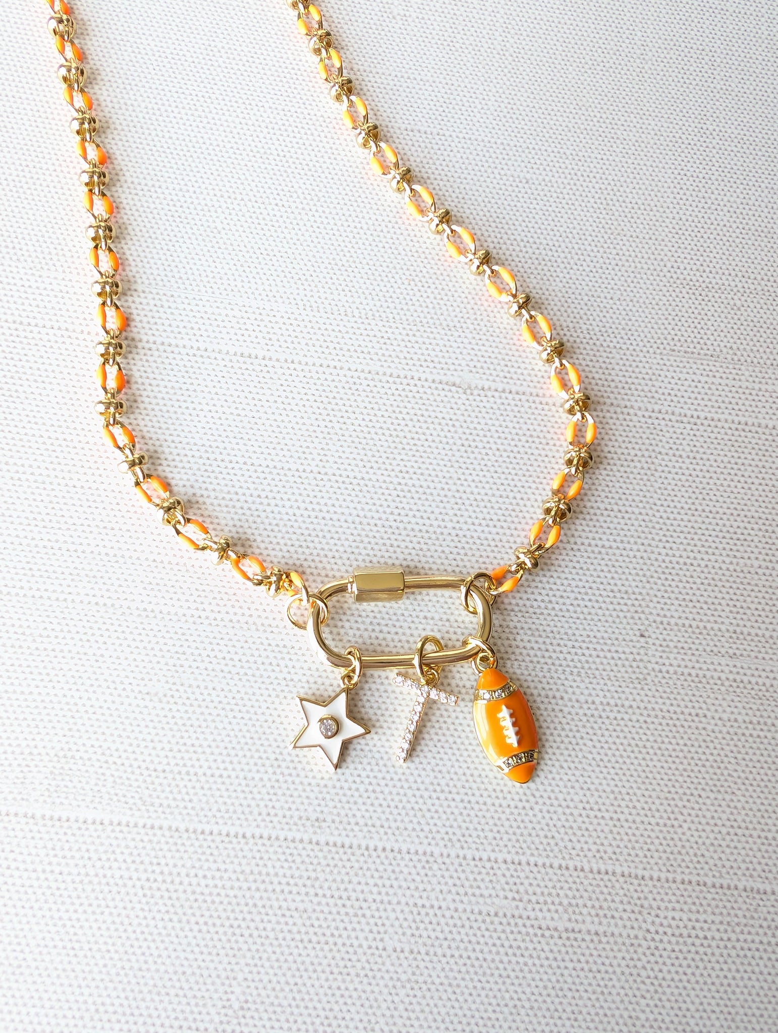 The front clasp makes swapping charms effortless, so you can style it your way for every game, tailgate, or everyday errand run. Made with a luxe gold-filled chain woven with orange accents, this limited-edition piece is truly a one-time release.