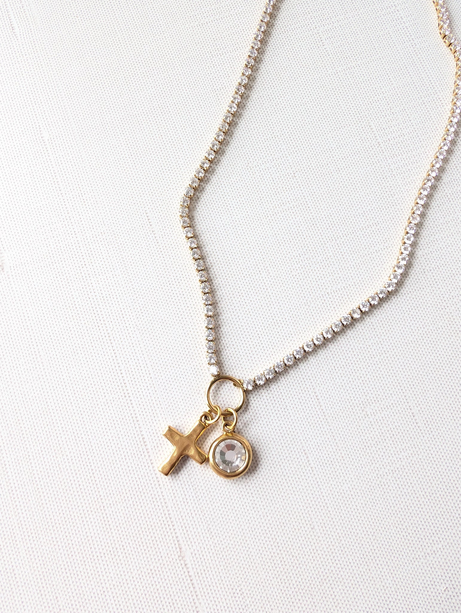 The Vintage Grace Tennis Necklace brings a touch of timeless elegance to your style. This 17-inch antique gold–plated tennis chain sparkles with a vintage-inspired finish and features two meaningful charms — a classic cross and a genuine Swarovski crystal pendant, both hanging about 1 inch. Beautiful on its own or layered with other favorites, it’s a graceful blend of faith, sparkle, and everyday wearability.
