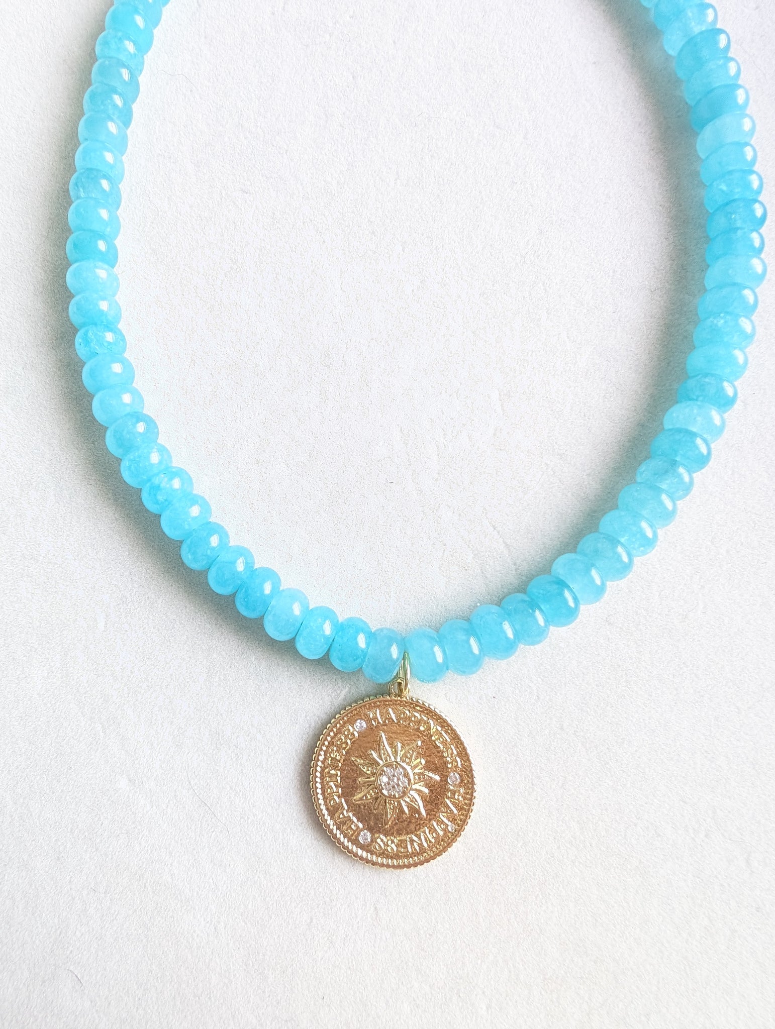 A bold pop of sea blue paired with a coin pave happiness charm for an elevated statement that still feels easy to wear.