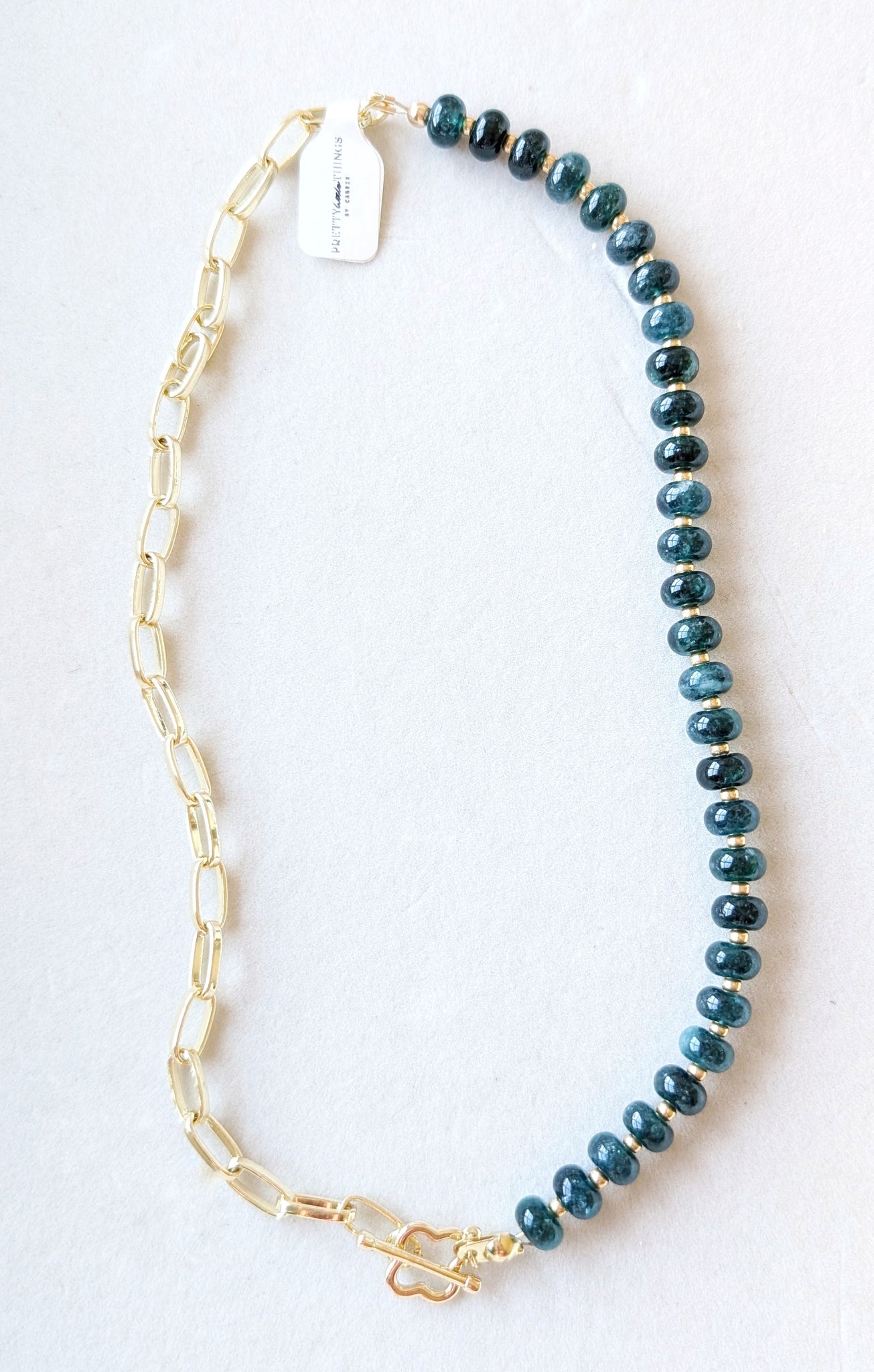A 16” gold-filled beaded link necklace showcasing deep jade green gemstone beads, a gold-filled paperclip chain, and a clover toggle for a chic, winter-inspired look