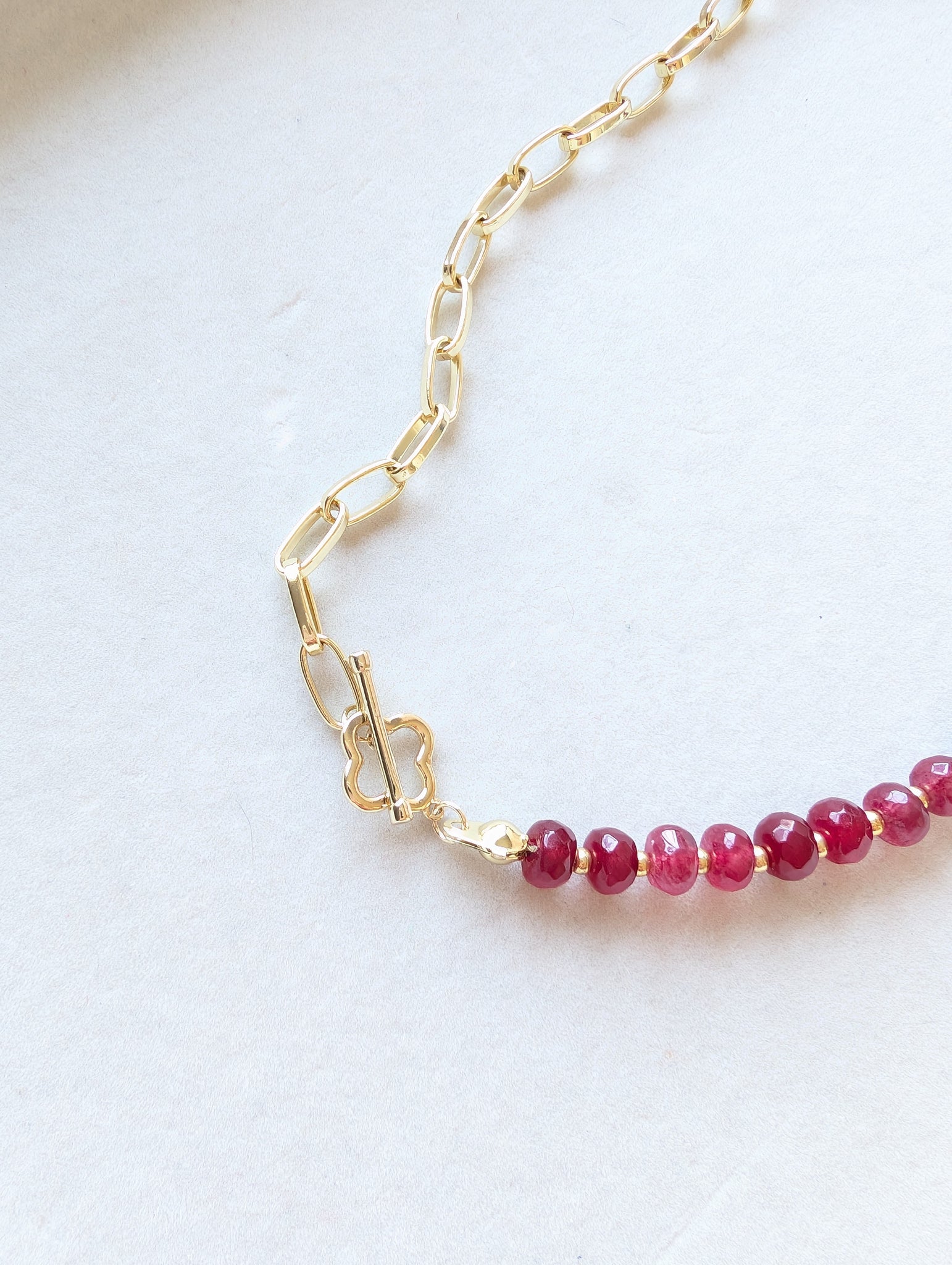 A 16” gold-filled beaded link necklace with rich berry-red gemstone beads, a gold-filled paperclip chain, and a signature clover toggle for a festive, polished finish.